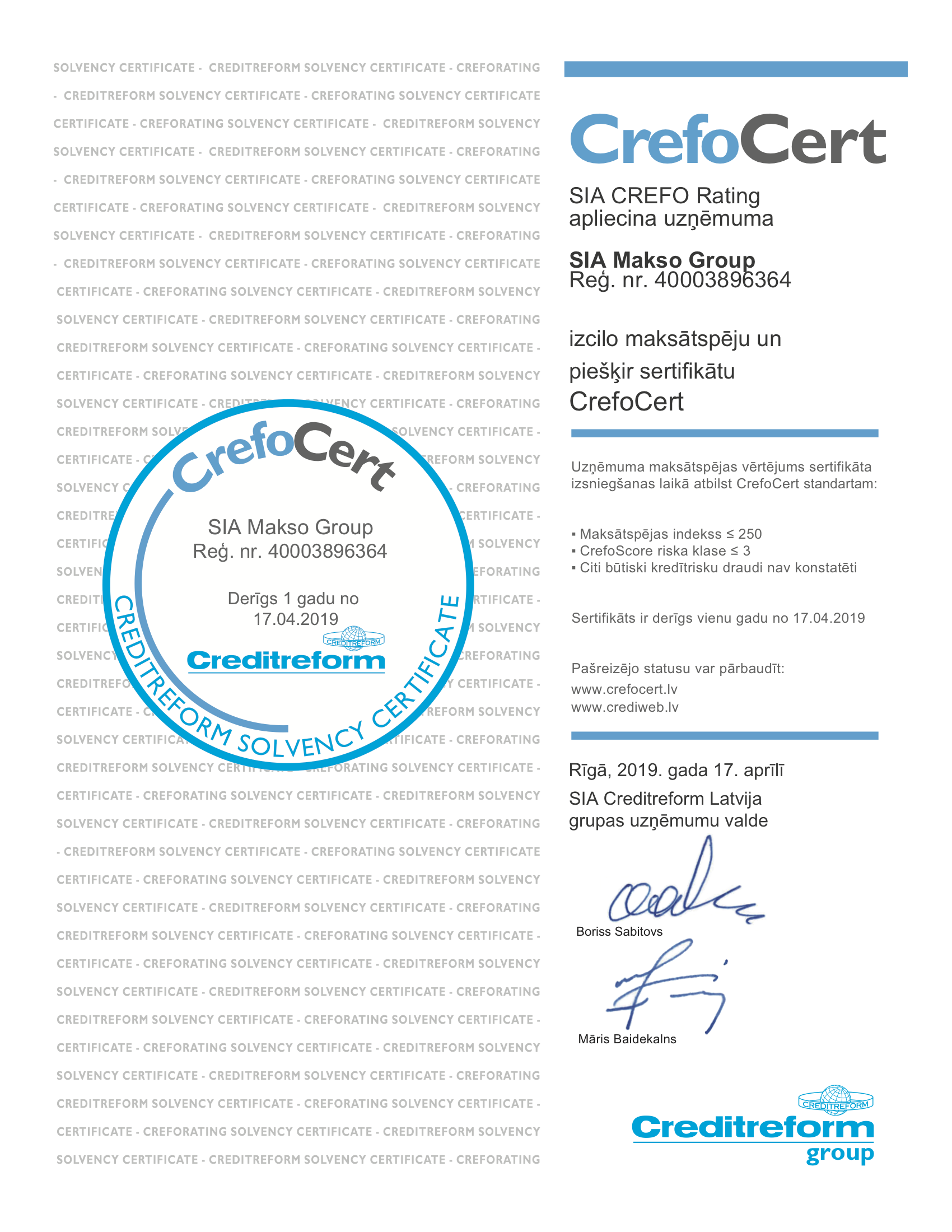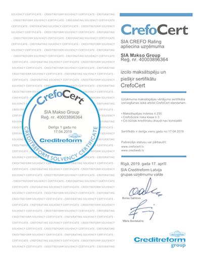 SIA CREFO Raiting apliecina uzņēmuma izcilo maksātspēju.